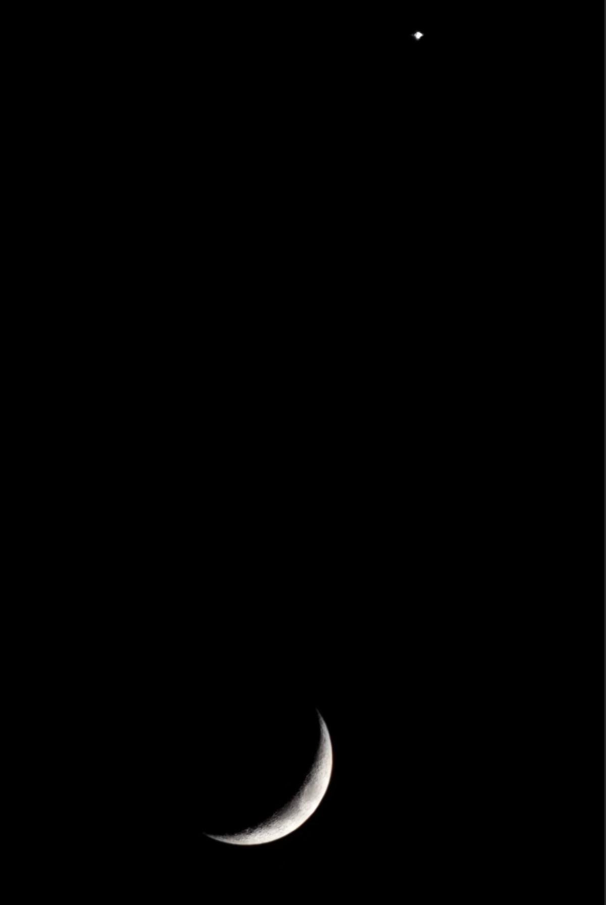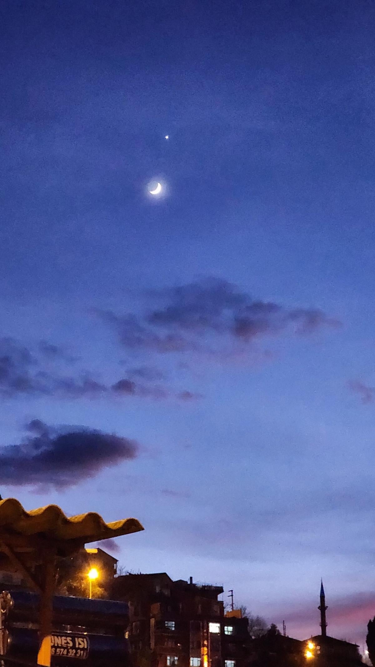 Gökyüzünde Ay'ın ince hilal formunun hemen üzerinde parlayan Venüs gezegeni, izleyenlerin büyük beğenisini kazandı.