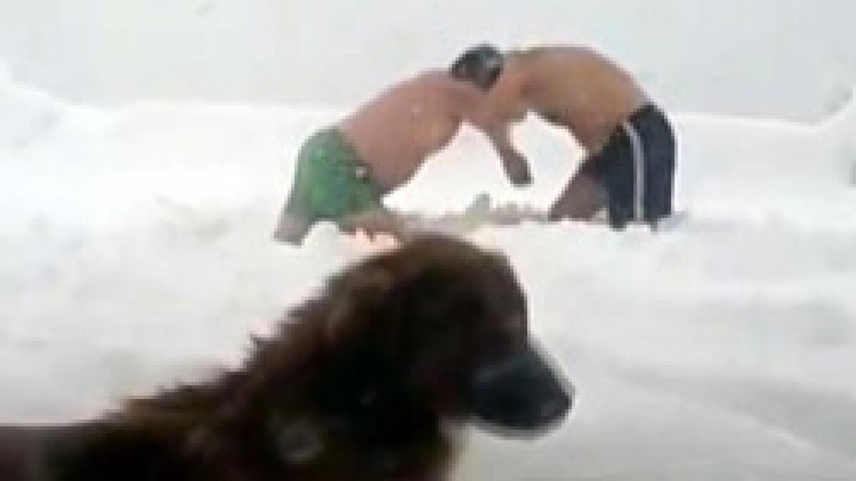İki arkadaş, dondurucu soğuğa aldırış etmeden karların içerisinde eğlendi.