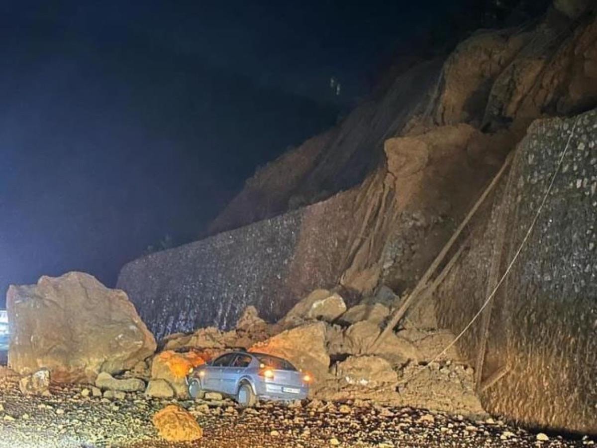 Kaya parçaları karayoluna düştü: Bir araç hasar aldı