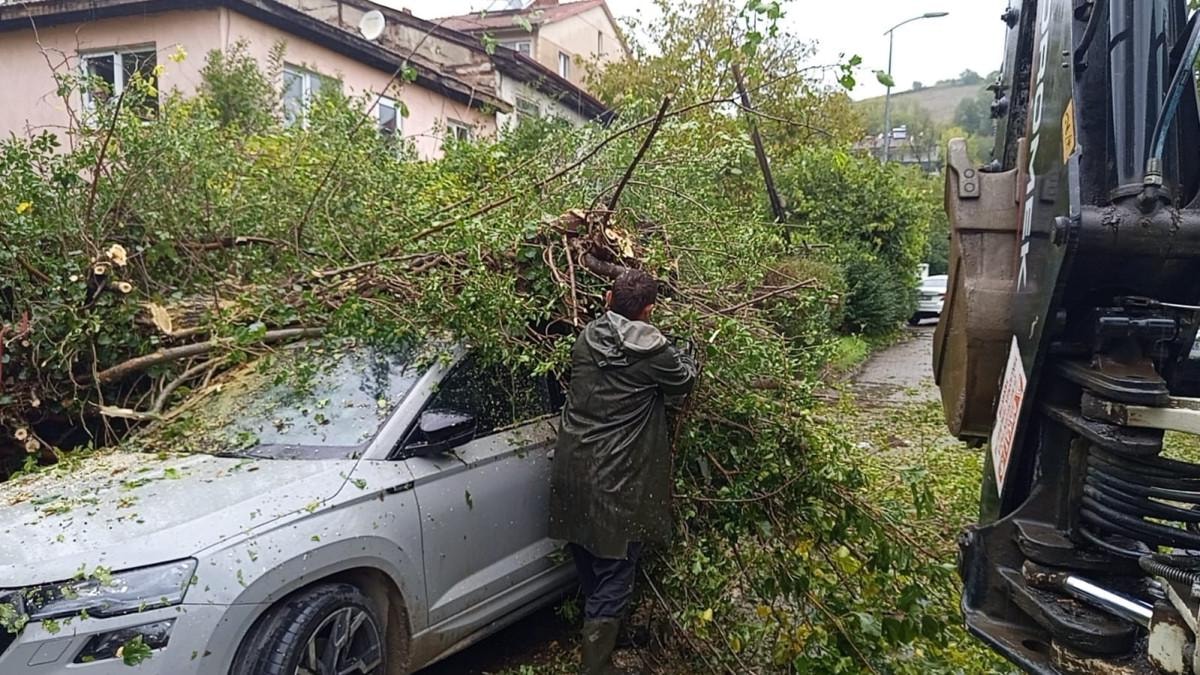 Fırtına nedeniyle park halinde bulunan 67 AFC 772 plakalı otomobilin üzerine ağaç devrildi.