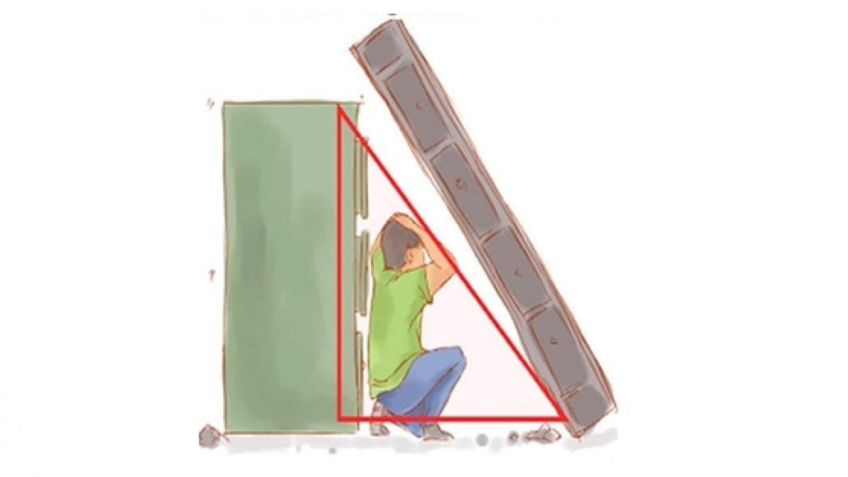Varsa sağlam sandalyelerle desteklenmiş masa altına veya dolgun ve hacimli koltuk, kanepe, içi dolu sandık gibi koruma sağlayabilecek eşya yanına çömelerek hayat üçgeni oluşturulmalıdır.