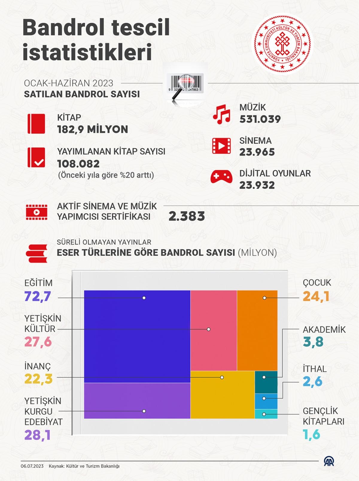 Türkiye'de Telif Hakları Genel Müdürlüğü'nün bandrol istatistiklerine göre, yılın ilk 6 ayında 182 milyon 895 bin 180 kitap bandrolü satışı gerçekleşti.