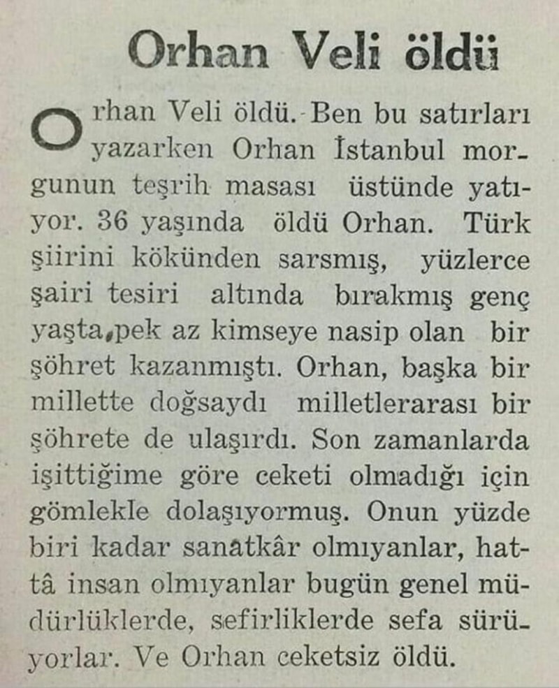 Şair Ece Ayhan'ın, Orhan Veli'nin ardından yazdığı "Orhan Veli Öldü" yazısını hatırlayalım.