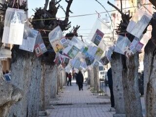 Ağaçlara asılan yaklaşık 1000 kitabı öğrencilere hediye eden belediye yetkililerinin bu projesinden öğrenciler memnun oldular.