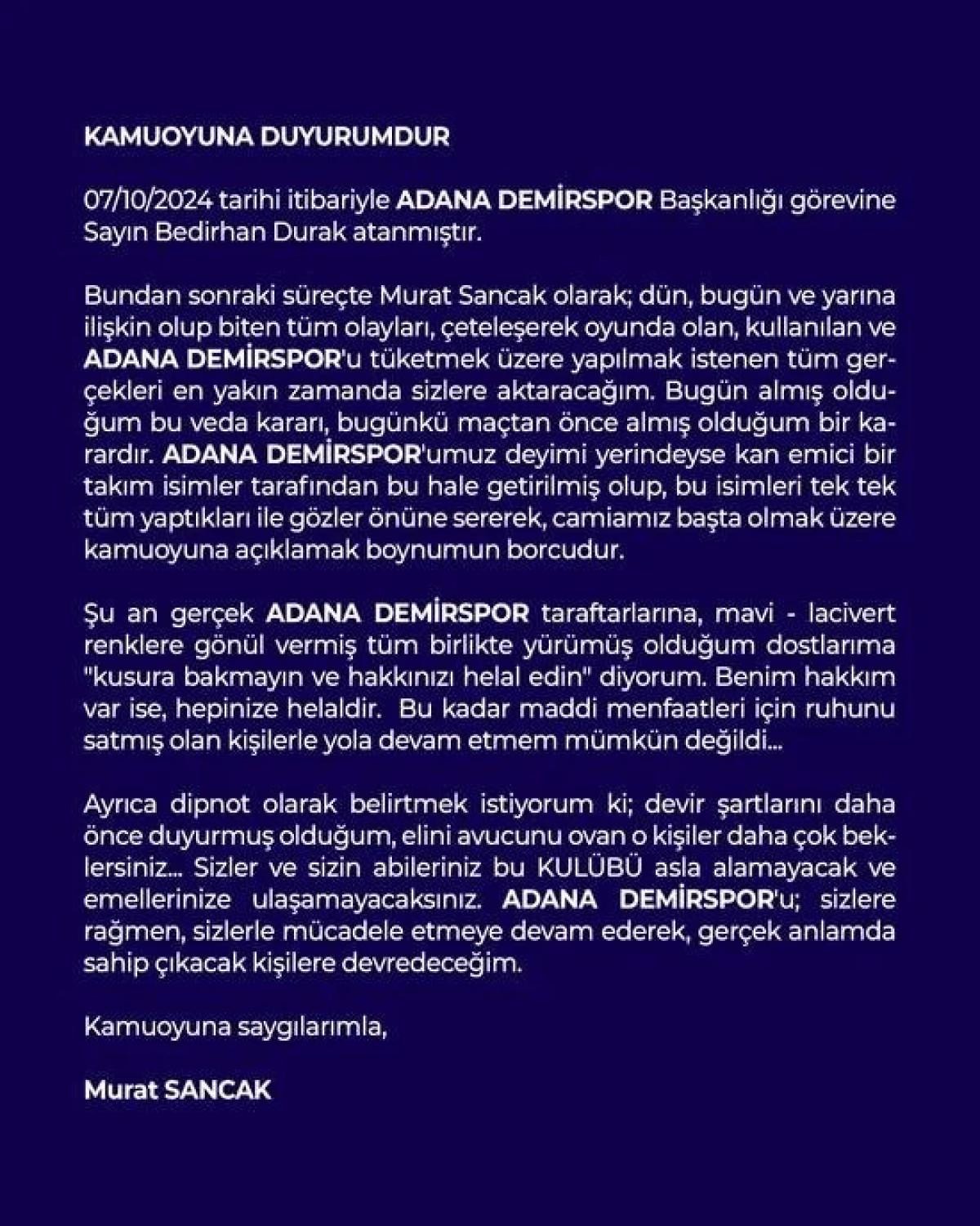 07/10/2024 tarihi itibariyle Adana Demirspor Başkanlığı görevine Sayın Bedirhan Durak atanmıştır. Bundan sonraki süreçte Murat Sancak olarak; dün, bugün ve yarına ilişkin olup biten tüm olayları, çeteleşerek oyunda olan, kullanılan ve Adana Demirspor'u tüketmek üzere yapılmak istenen tüm gerçekleri en yakın zamanda sizlere aktaracağım.