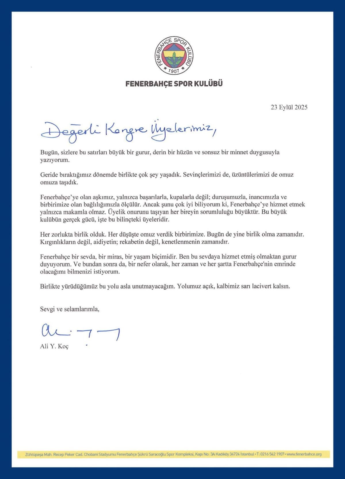 - Fenerbahçe'nin eski başkanı Ali Koç, kongre üyelerine veda mektubu gönderdi.
