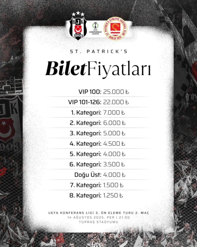 UEFA Konferans Ligi 3. Eleme Turu rövanşında 14 Ağustos Perşembe günü İrlanda ekibi St. Patrick's'i ağırlayacak Beşiktaş, müsabakanın biletlerini yarın satışa sunacak.