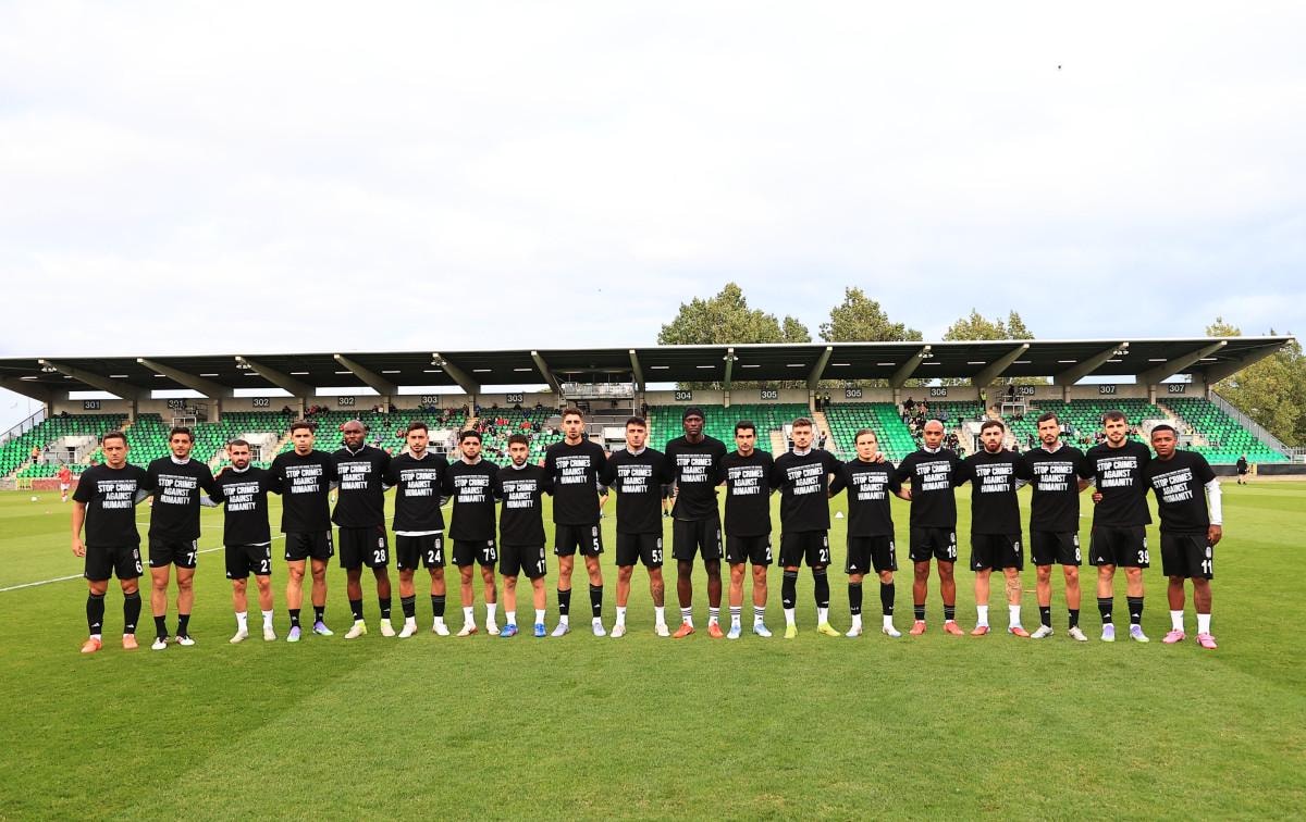 Beşiktaşlı futbolcular, St. Patrick's maçı öncesinde ısınmaya Gazze'ye destek tişörtleriyle çıktı.