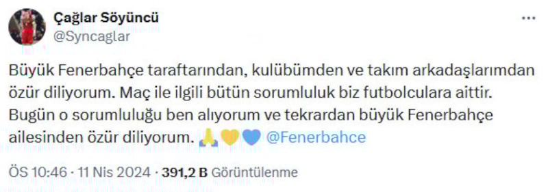 Fenerbahçe'de Çağlar Söyüncü, Olympiakos'a 3-2 yenildikleri maçın ardından sosyal medya hesabından bir paylaşımda bulundu. Söyüncü paylaşımında taraftardan, kulüpten ve takım arkadaşlarından özür diledi.