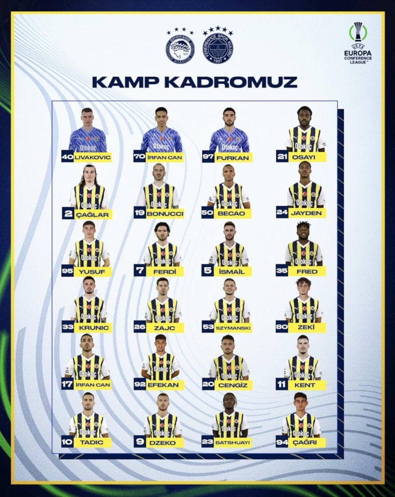 Temsilcimi Fenerbahçe'nin Yunan ekibi Olympiakos'la deplasmanda oynayacağı UEFA Avrupa Konferans Ligi çeyrek final ilk maçının kamp kadrosu belli oldu.