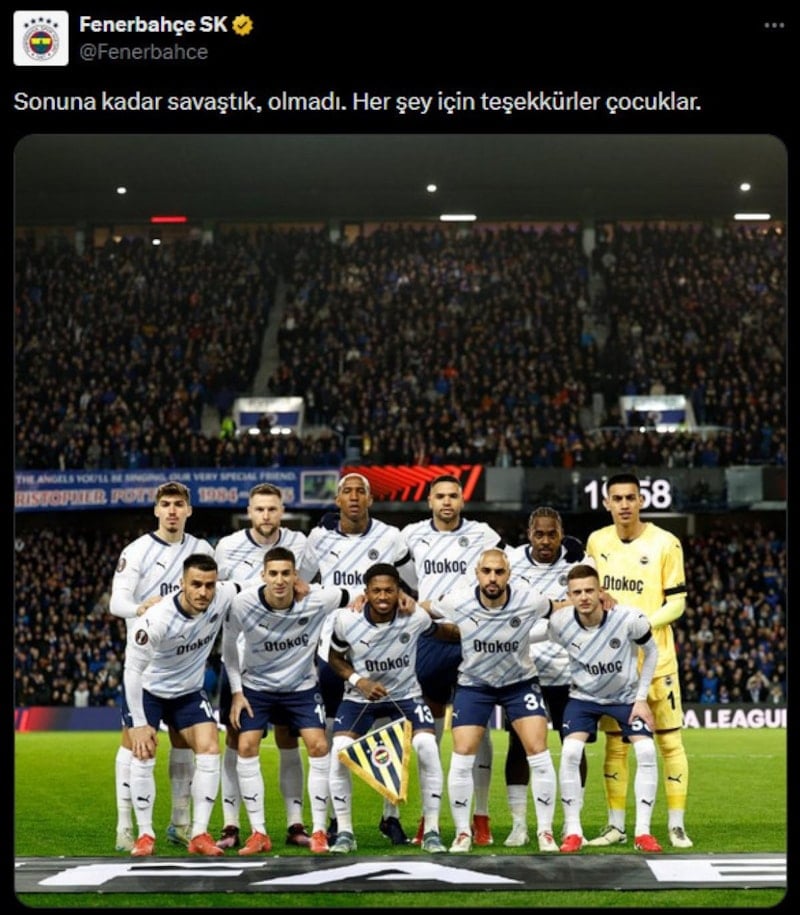 UEFA Avrupa Ligi'nde son 16 turu rövanş karşılaşmasında turnuvaya veda eden Fenerbahçe, Rangers maçı sonrası resmi hesabından bir paylaşım yaptı.