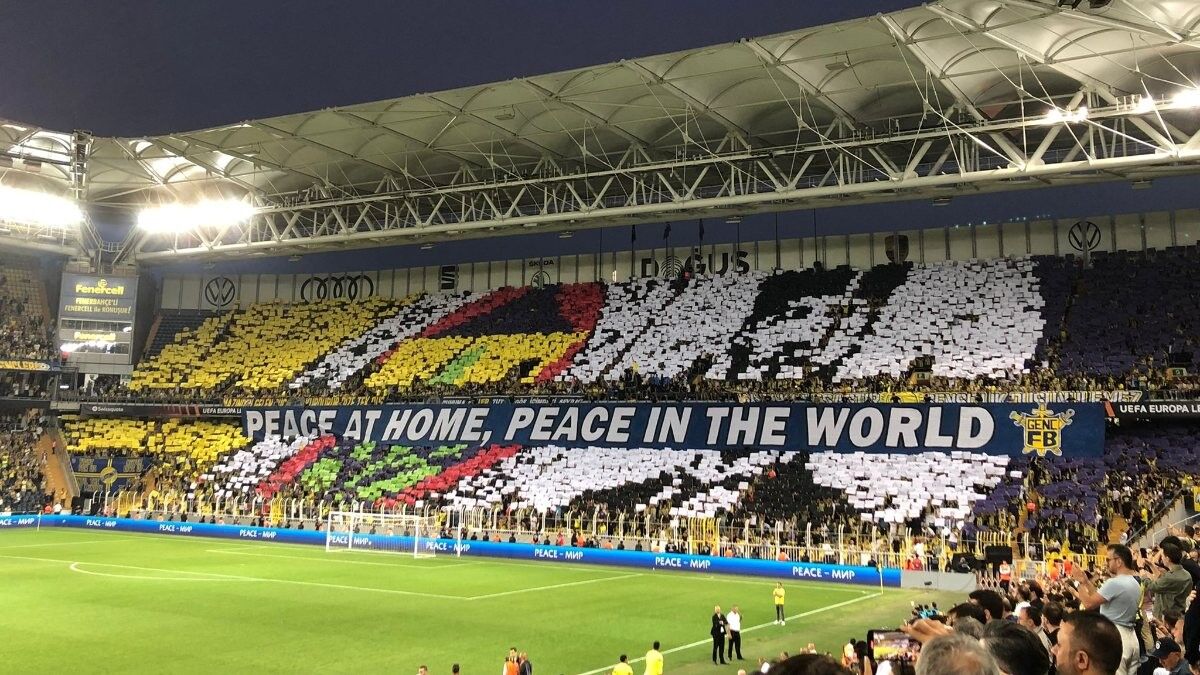 Sarı-lacivertli taraftarlar hazırlanan koreografide Mustafa Kemal Atatürk'ü resmederken, "Peace at home, peace in the world." yani, "Yurtta sulh, cihanda sulh." ifadelerini kullandı.