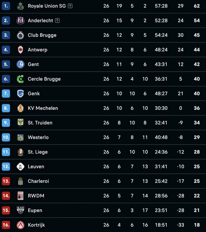Union Saint-Gilloise, ligde ise 26 maç sonunda 19 galibiyet, 5 beraberlik ve 2 mağlubiyetle 62 puan topladı.