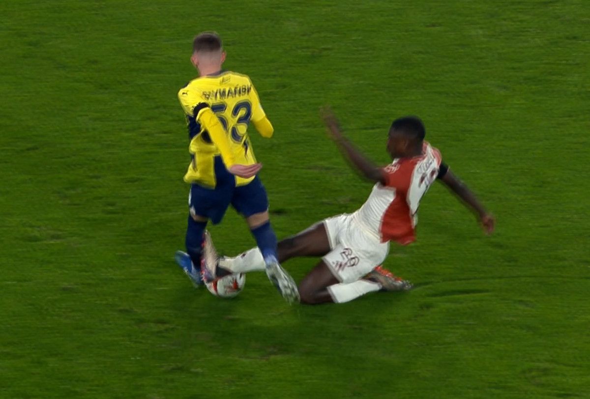 Lyon'da Sael Kumbedi, 31. dakikada Sebastian Szymanski'ye yaptığı faul sonrası sarı kart gördü.