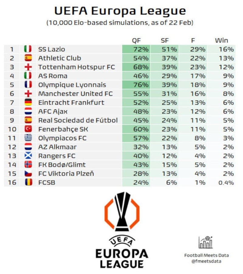 Athletic Bilbao-Roma eşleşmesinde İspanyollar için hesaplanan olasılık yüzde 54. E.Frankfurt ile Ajax'ı karşı karşıya getirecek eşleşmede ise favori Almanlar.