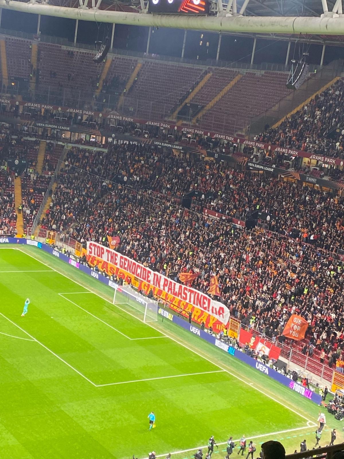 Sarı-kırmızılı taraftarlar, Doğu Tribünü’nde açılan pankartta, "Filistin’e olan sarsılmaz destekleri için Celtic taraftarlarına teşekkür ediyoruz" ifadelerine yer verdi.