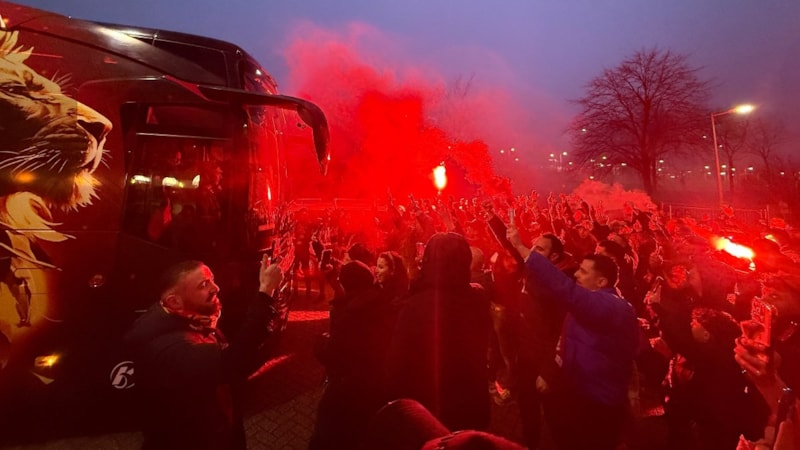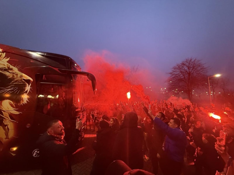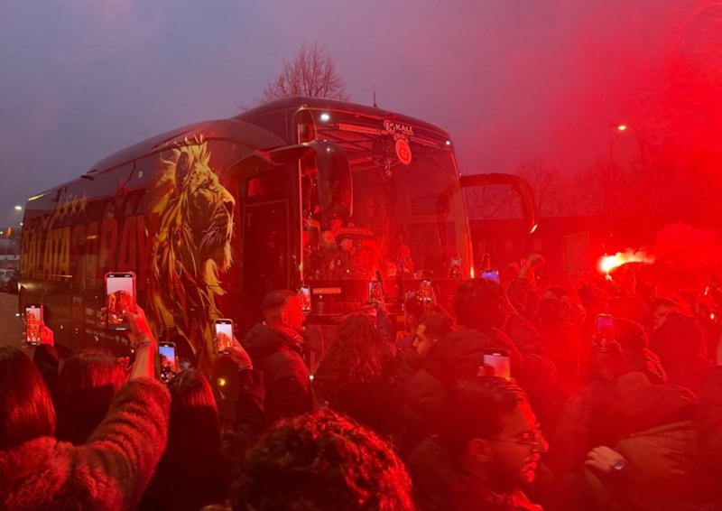 Takım otobüsünün otele varmasıyla birlikte, Hollanda’daki Galatasaray taraftarları meşaleler yakarak ve pankartlar açarak futbolculara sevgi gösterisinde bulundu. Tezahüratlarla takımlarına destek veren taraftarlar, atmosferi adeta bir tribün havasına çevirdi. Yoğun ilgi karşısında şaşkınlıklarını gizleyemeyen futbolcular, taraftarların coşkusuna selamla karşılık verdikten sonra otele geçerek dinlenmeye çekildi.