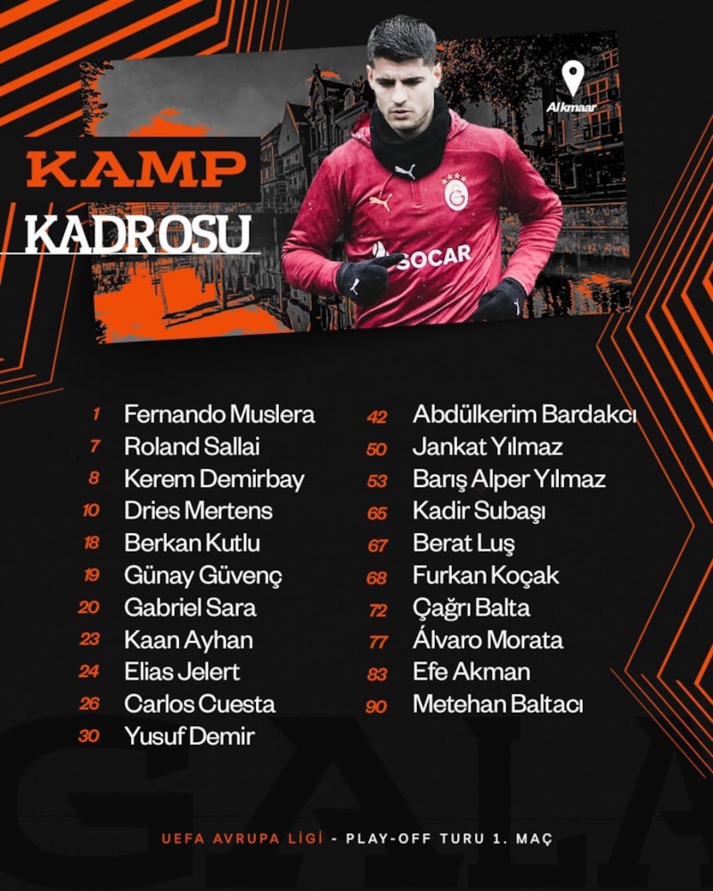 Galatasaray, AZ Alkmaar ile deplasmanda oynayacağı UEFA Avrupa Ligi eleme turu play-off ilk maçı öncesi kamp kadrosunu açıkladı.