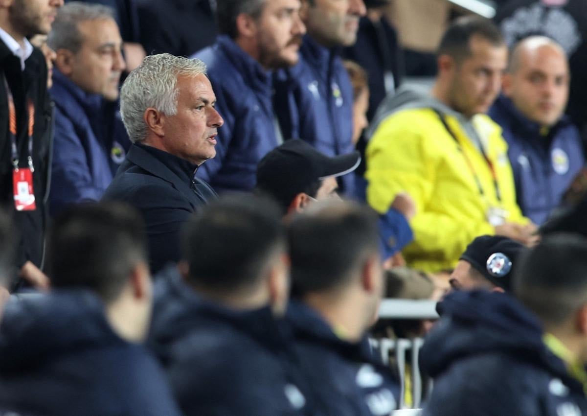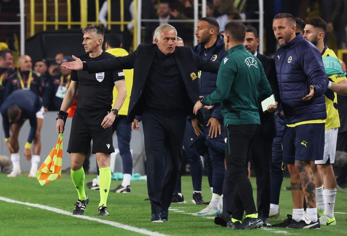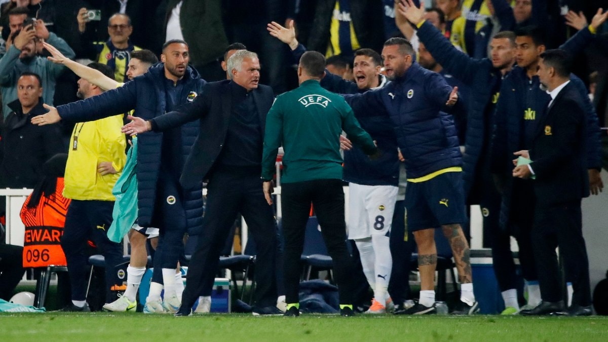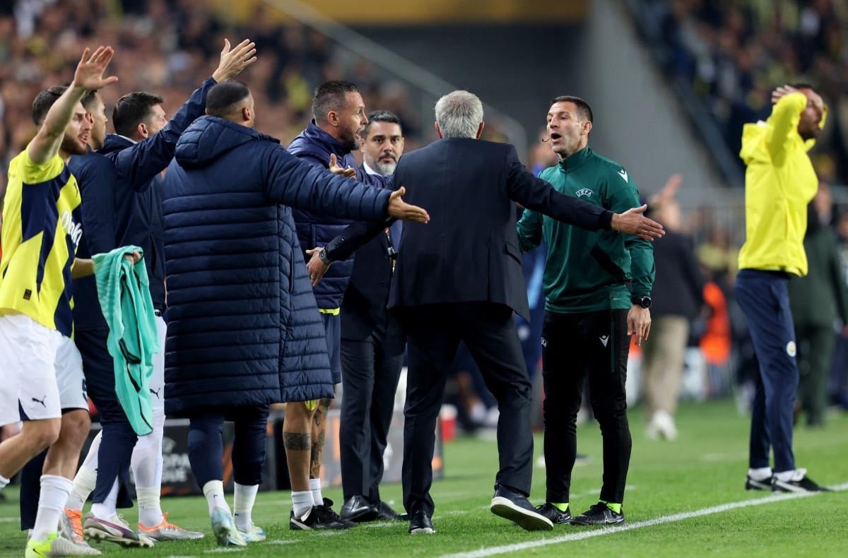 Hakem Turpin, itirazların ardından 59. dakikada Fenerbahçe Teknik Direktörü Jose Mourinho'ya kırmızı kart gösterdi.