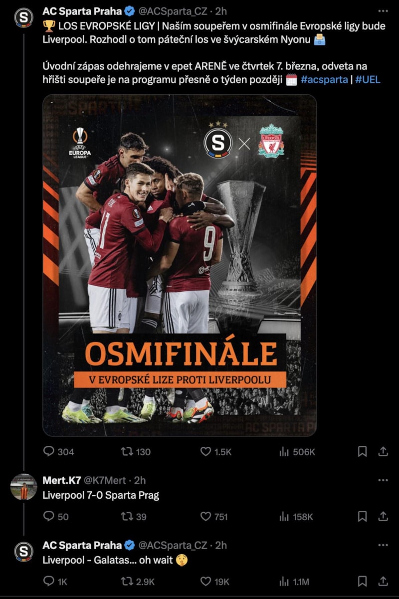 Çek ekibinin Liverpool ile eşleştiklerini açıkladığı paylaşıma, "Liverpool 7-0 Sparta Prag" yorumu yapan bir Galatasaray taraftarına yanıt veren Sparta Prag resmi hesabı, taraftara "Liverpool - Galatas... Bekle biraz" cevabını verdi.