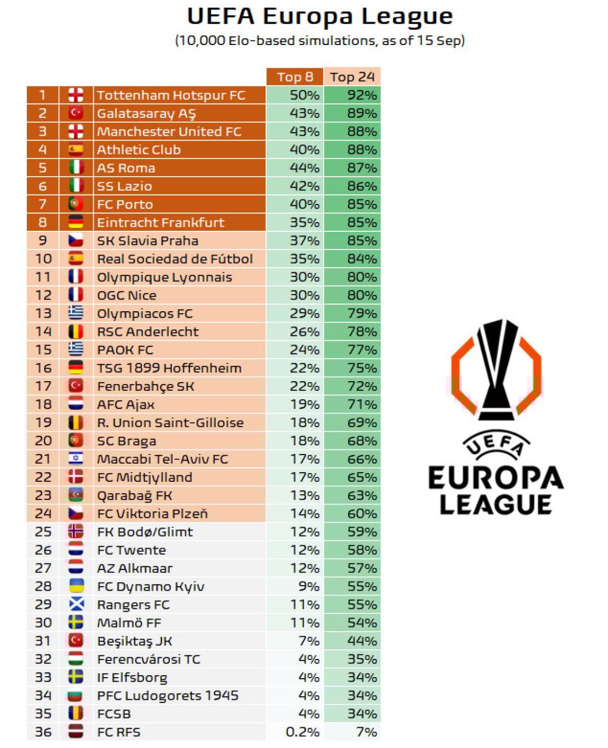 Football Meets Data, UEFA Avrupa Ligi'nde mücadele eden ekiplerin çeyrek finale kalma ihtimallerini oranlarıyla birlikte açıkladı.