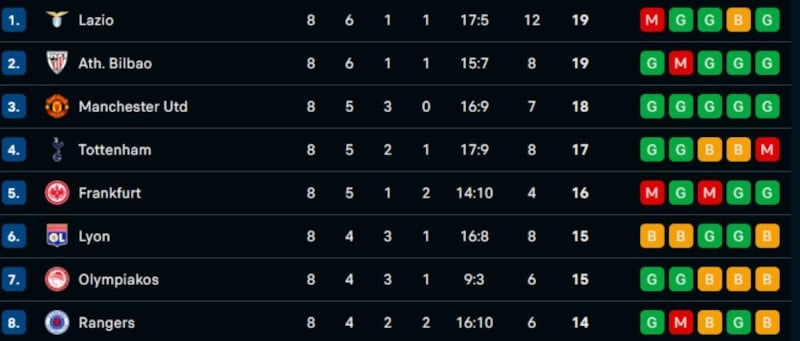 İlk 8 içerisinde yer alan; Lazio, Athletic Bilbao, Manchester United, Totthenham, Eintracht Frankfurt, Lyon, Olympiakos ve Rangers son 16 biletini aldı.