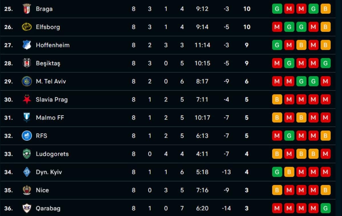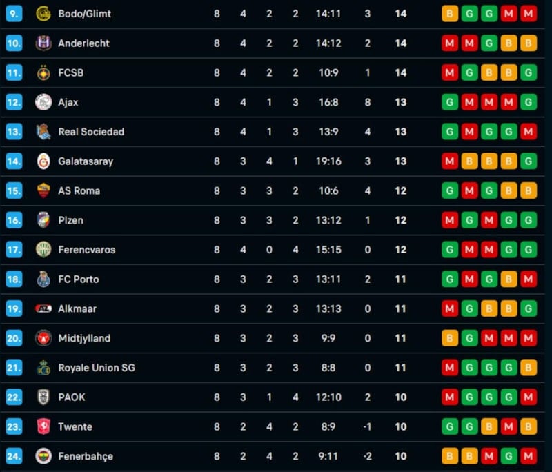 9 ile 24 arasında sıralanan; Bodo/Glimt, Anderlecht, FCSB, Ajax, Real Sociedad, Galatasaray, Roma, Viktoria Plzen, Ferencvaros, Porto, AZ Alkmaar, Midtjylland, Union Saint-Gilloise, PAOK, Twente ve Fenerbahçe play-off turunda yer alırken; Sporting Braga, Elfsborg, Hoffenheim, Beşiktaş, Maccabi Tel Aviv, Slavia Prag, Malmö, Rigas Skola, Ludogorets Razgrad, Dynamo Kiev, Nice ve Karabağ ise UEFA Avrupa Ligi’ne veda etti.