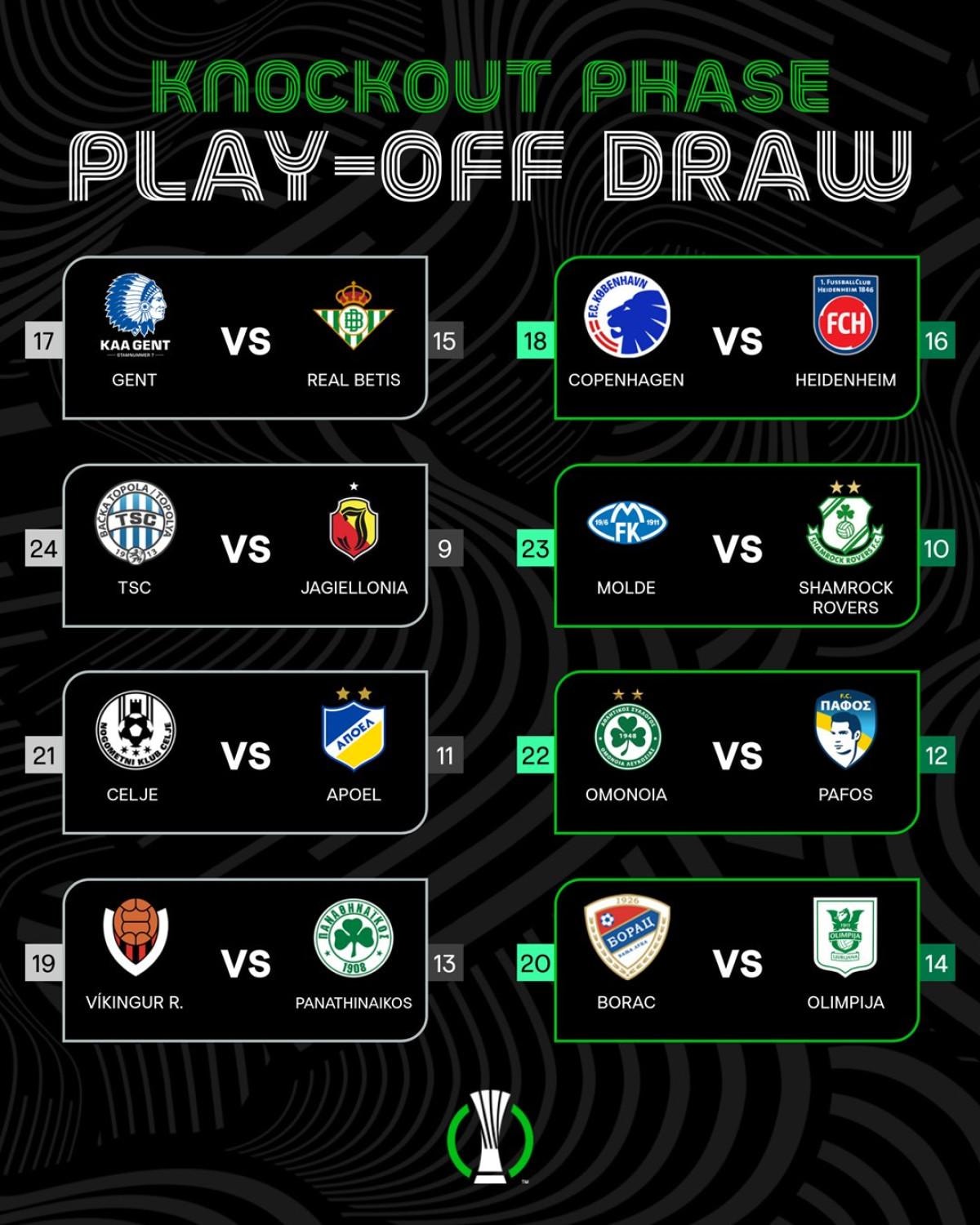 Lig aşamasında ilk 8 sırayı alan Chelsea (İngiltere), Vitoria (Portekiz), Fiorentina (İtalya), Rapid Wien (Avusturya), Djurgarden (İsveç), Lugano (İsviçre), Legia Varşova (Polonya) ve Cercle Brugge (Belçika) ile play-off turunu geçecek 8 takım, son 16 turunda mücadele edecek. Son 16, çeyrek ve yarı final kuraları ise 21 Şubat'ta çekilecek.