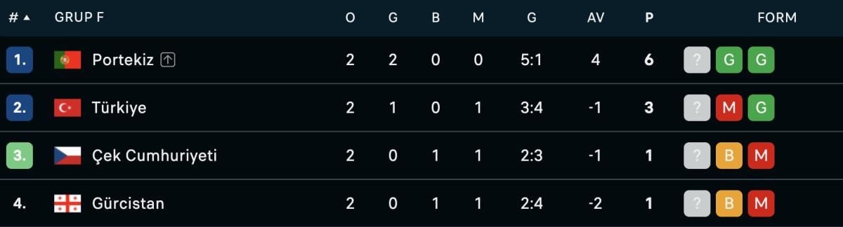 Grupta bugün oynanan maçta 1-1 berabere kalan Çekya ve Gürcistan'ın ise 1'er puanı bulunuyor.