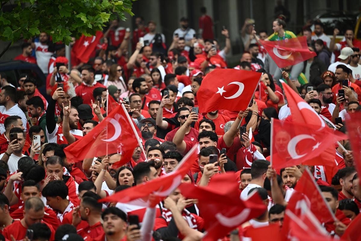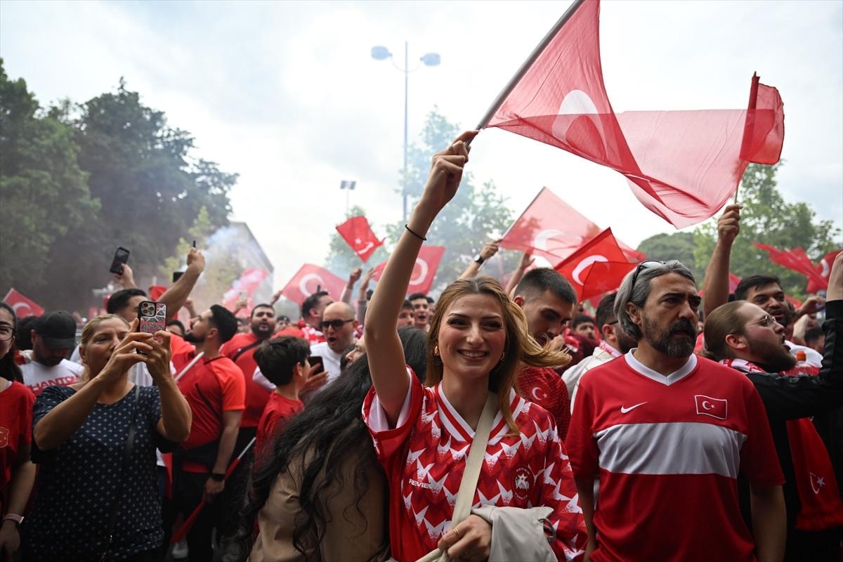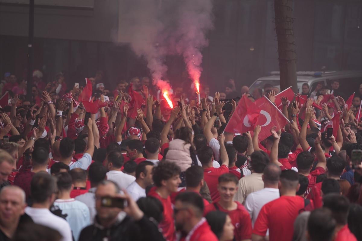 Burada binlerce Türk taraftarı meşaleler yakıp, tezahüratlar söyleyerek millilere destek oldu.