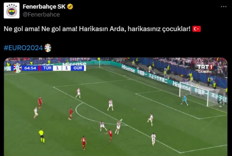 Fenerbahçe eski yıldızının golü sonrası, "Ne gol ama! Ne gol ama! Harikasın Arda, harikasınız çocuklar!" ifadeleriyle bir paylaşım gerçekleştirdi.