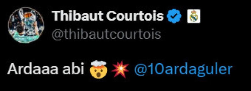 Arda Güler'in Real Madrid'den takım arkadaşı Thibaut Courtois, gol sonrası ilk paylaşım yapan isimlerden oldu. Belçikalı kaleci, 'Arda abi' ifadesiyle bir gönderi gerçekleştirdi.