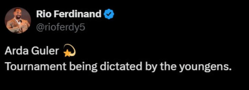 İngiliz futbolunun efsane isimlerinden olan ve şimdilerde yorumculuk kariyeriyle öne çıkan Rio Ferdinand ise Arda Güler'in golü sonrası ismini geçirerek yaptığı paylaşımda, "Turnuvaya gençler yön veriyor" ifadelerini kullandı.