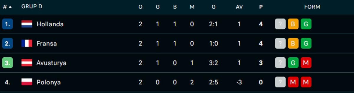 2024 Avrupa Futbol Şampiyonası (EURO 2024) D Grubu üçüncü maçında Hollanda ile Avusturya karşılaşacak.