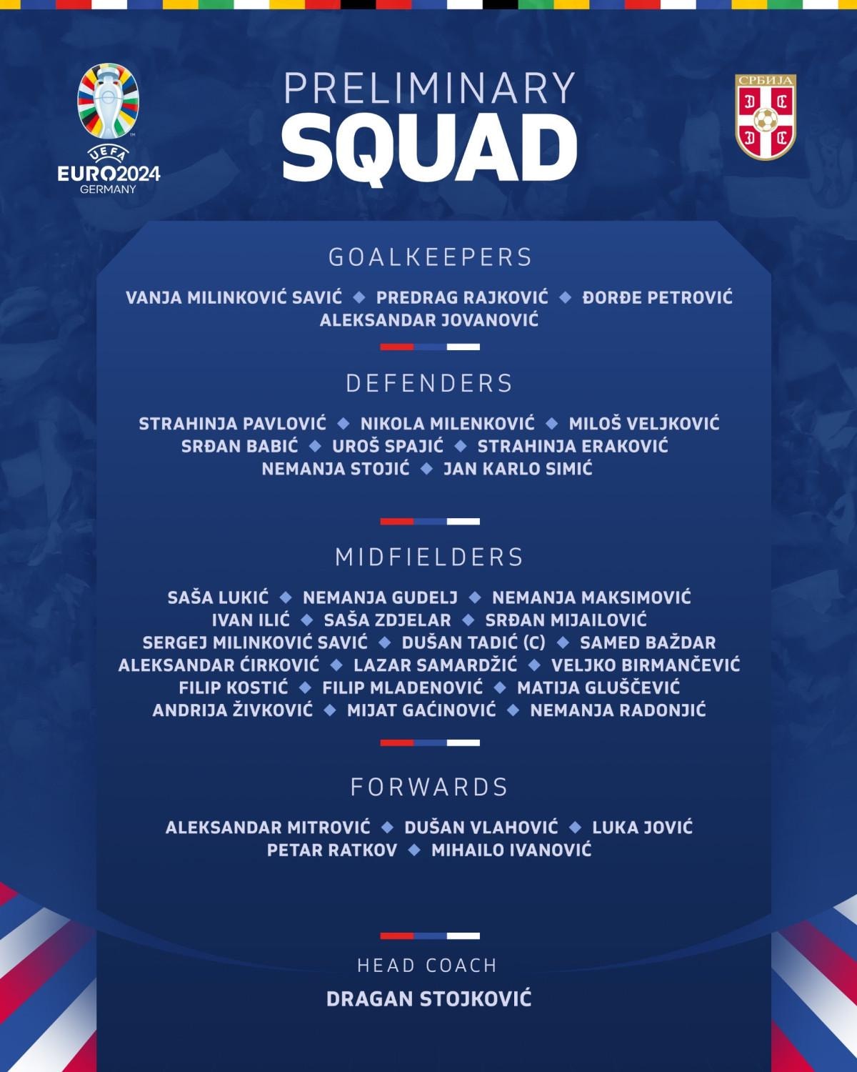 Sırbistan Milli Takımı Teknik Direktörü Dragan Stojkovic tarafından belirlenen 35 kişilik geniş kadro daha sonra 26'ya inecek.