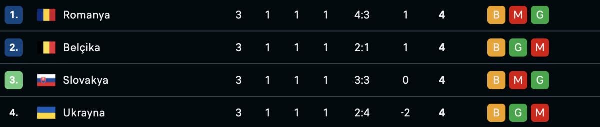 Bu sonuçla Romanya gruptan lider olarak çıkarken, Slovakya ise üçüncü olarak adını bir üst tura yazdırdı.