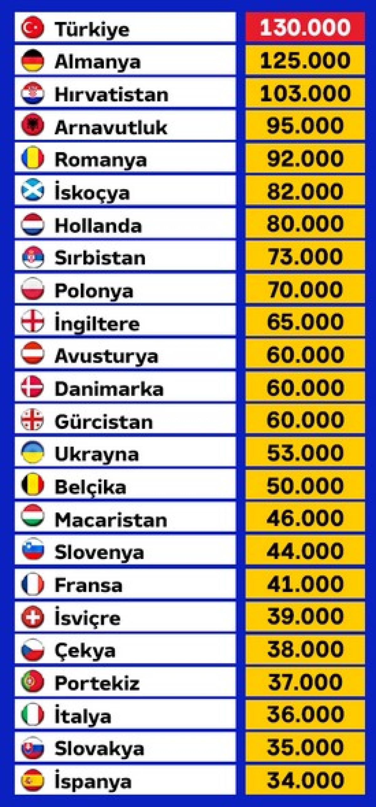 Buna göre A Milli, Futbol Takımını desteklemeye gelen Türk taraftarlar, Almanya'yı bile geride bırakarak 130 bin seyirci ile zirveye yerleşti.