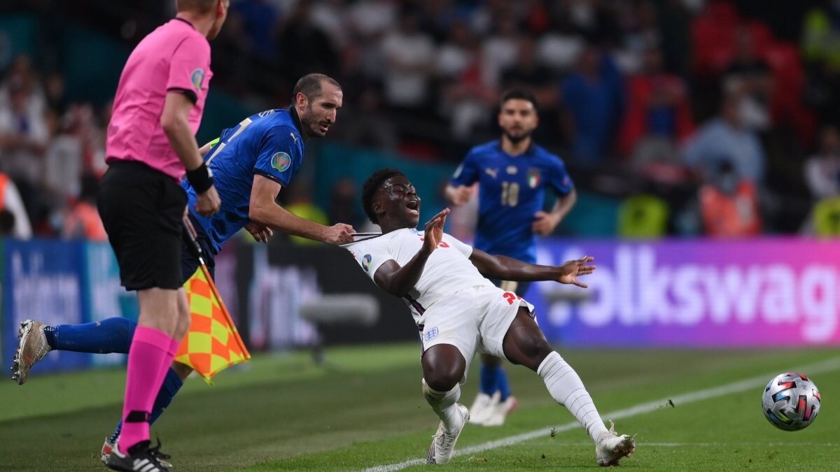 Chiellini'nin maçın normal süresinin son anlarında yaptığı faul gündem oldu. İngiltere'de Saka'nın sağ kanatta geliştirdiği pozisyonda İtalyan oyuncu, rakibinin formasına asılarak yere düşürdü.