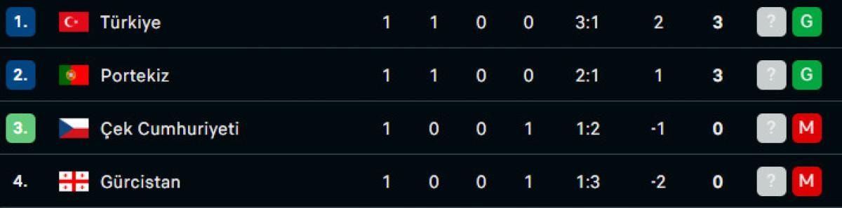 F Grubu'nda ilk maçlar sonunda oluşan puan durumu şöyle: