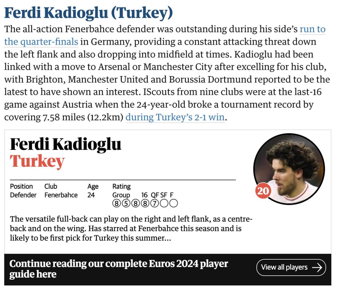 İngiltere'nin The Guardian gazetesi, 2024 Avrupa Futbol Şampiyonası'nda değerine değer katan oyuncuları belirledi.