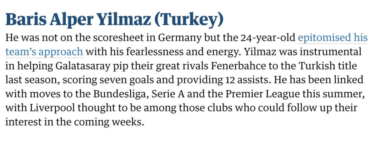 Almanya'da gol atmasa da 24 yaşındaki oyuncu, turnuvadaki takımının yaklaşımını korkusuzluğu ve enerjisiyle özetledi. Yılmaz, geçen sezon Galatasaray'ın ezeli rakipleri Fenerbahçe'yi geçerek Türkiye şampiyonluğuna ulaşmasında etkili oldu, yedi gol attı ve 12 gol pası verdi. Bu yaz Bundesliga, Serie A ve Premier Lig'e transfer olmasıyla anıldı ve Liverpool'un önümüzdeki haftalarda ilgisini ortaya koyabilecek kulüpler arasında olduğu düşünülüyor.