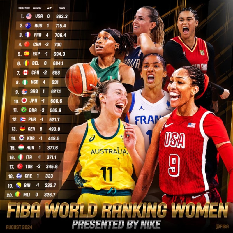 Uluslararası Basketbol Federasyonu (FIBA), Paris 2024 Olimpiyat Oyunları ve FIBA Kadınlar Dünya Kupası 2026 ön elemelerinin sona ermesinin ardından dünya sıralamasını paylaştı.