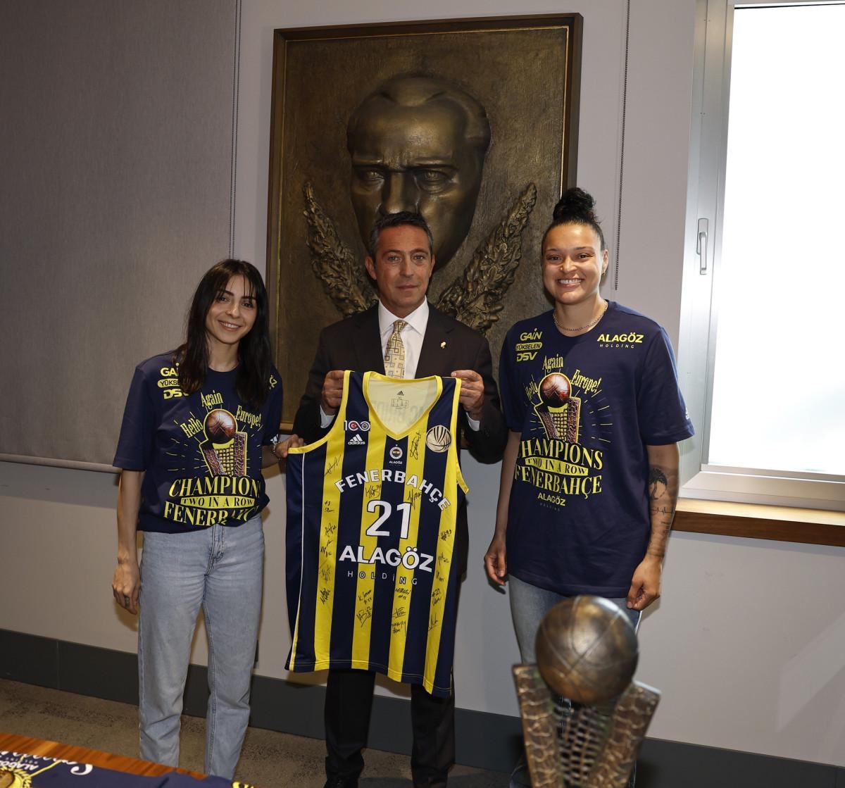 Fenerbahçe Kadın Basketbol Takımımızı yönetim kurulu odamızda ağırlıyoruz. Bu sezon buraya iki kupa getirmişlerdi, şimdi iki kupa daha getirdiler. 3 gün arayla hem Avrupa hem de lig kupasını kazandılar. Sezon başında Türkiye’ye ilk defa FIBA Süper Kupası’nı getirdiler. Devamında Türkiye Kupası’nı kazandılar. Bir başkan, yönetici olarak daha ne isteyebiliriz ama daha da önemlisi takımımızın sahaya çıktığı zaman her daim kazanabileceğini bilmek, geri düştükleri zaman dönebileceklerine inanmak, maç seyrederken büyük lüks. Toplamda bütün kulvarlarda 57 maçta 55 galibiyet aldık. Bu da olağanüstü istatistik. Tüm camiamız adına sizlere teşekkür ediyorum. Gurur duyuyorum. Kendinizle ne kadar gurur duysanız azdır. 'Buraya gelmek zor, burada kalmak daha da zor' diye geçen sene söylemiştim. Burada kaldık ve üstüne koyarak devam ettik. 4 kupa aldık. Kayıtsız şartsız ve tartışmasız Avrupa’nın en iyi kadın basketbol kadın takımı olduğumuzu sahada gösterdiniz.