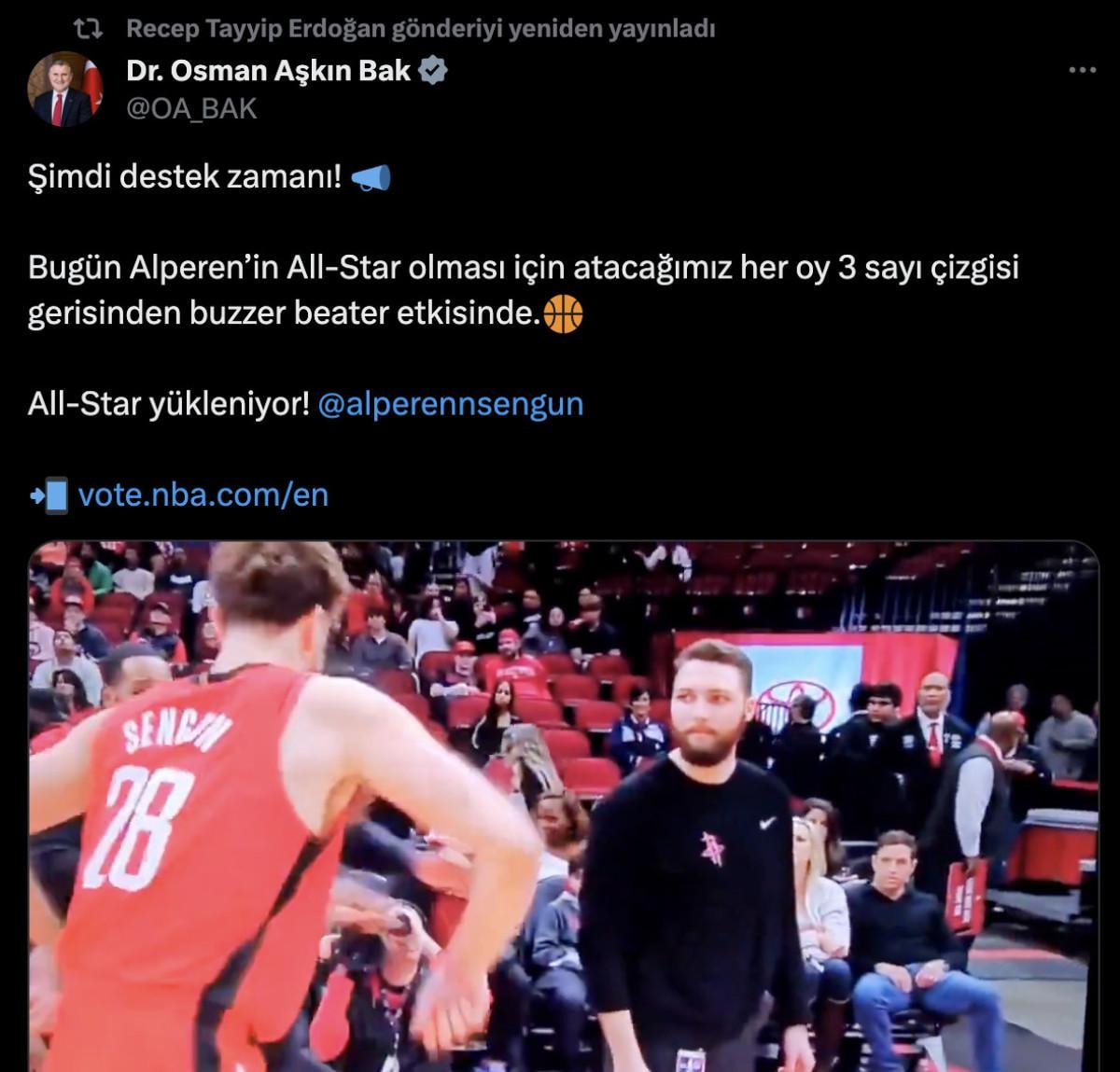 Öte yandan Gençlik ve Spor Bakanı Osman Aşkın Bak, sosyal medya hesabı üzerinden pivot Şengün için NBA All-Star oylamasında destek için paylaşımda bulundu.