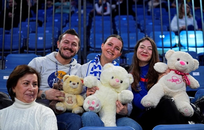Maça yanlarında peluş oyuncakla gelen basketbolseverler, müsabaka öncesinde oyuncakları sahaya atarak dayanışmaya katıldı.