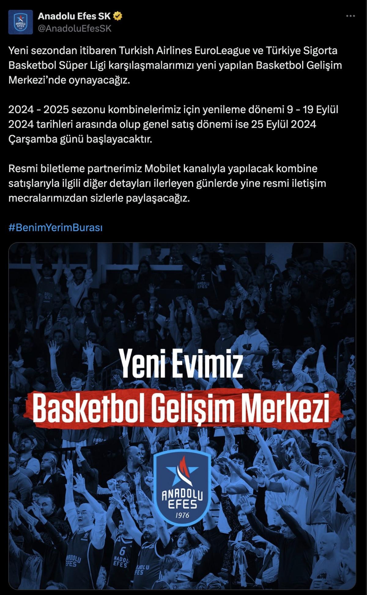 Yeni sezondan itibaren EuroLeague ve Türkiye Sigorta Basketbol Süper Ligi karşılaşmalarımızı yeni yapılan Basketbol Gelişim Merkezi'nde oynayacağız. 2024-2025 sezonu kombinelerimiz için yenileme dönemi 9-19 Eylül 2024 tarihleri arasında olup genel satış dönemi ise 25 Eylül 2024 Çarşamba günü başlayacaktır.