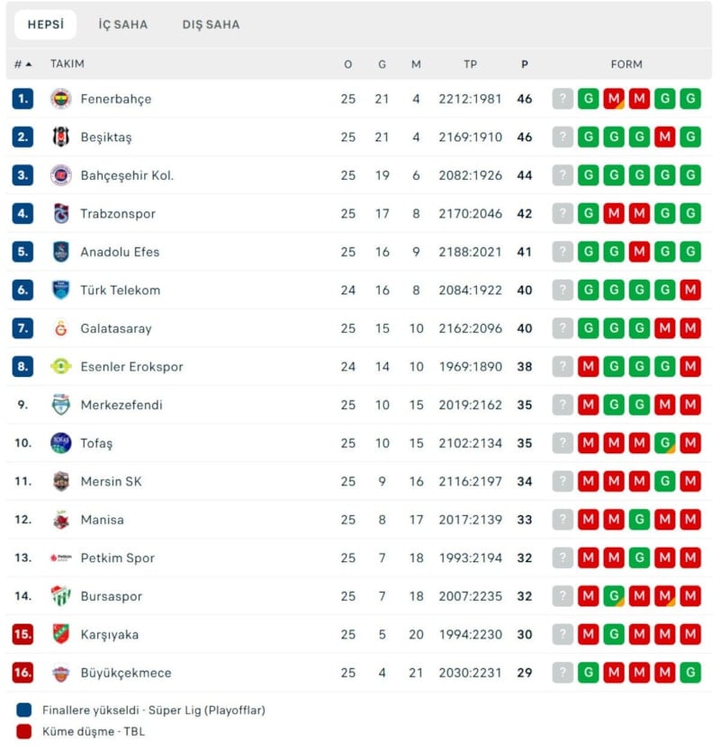 Düşme hattının hemen üzerinde bulunan Bursaspor ve Aliağa Petkimspor'un yedişer, Manisa Basket'in 8 ve Mersin Spor'un 9 galibiyeti bulunuyor.