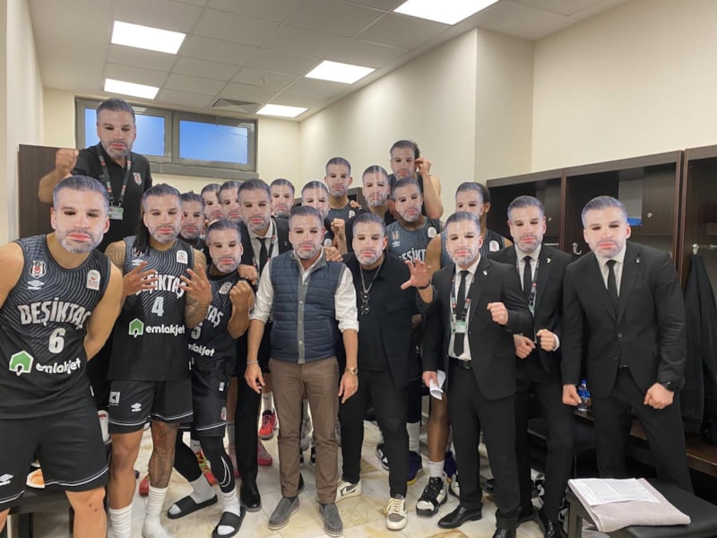 Teknik ekip ve basketbolcular, galip gelinen maç sonrası soyunma odasında Sırp koçun maskesini taktı.