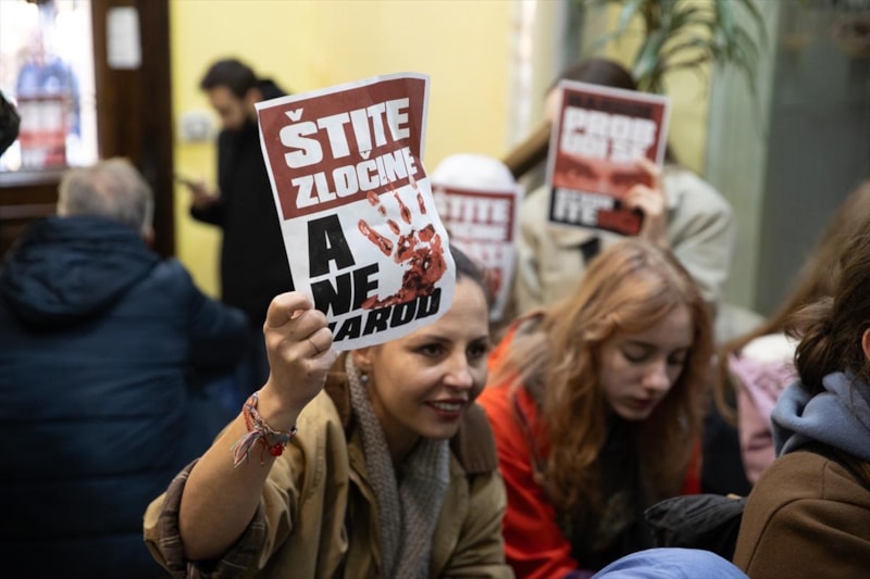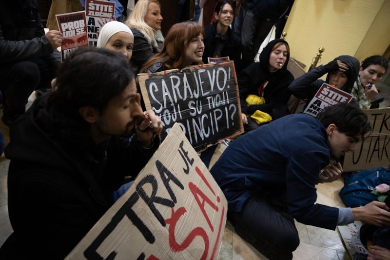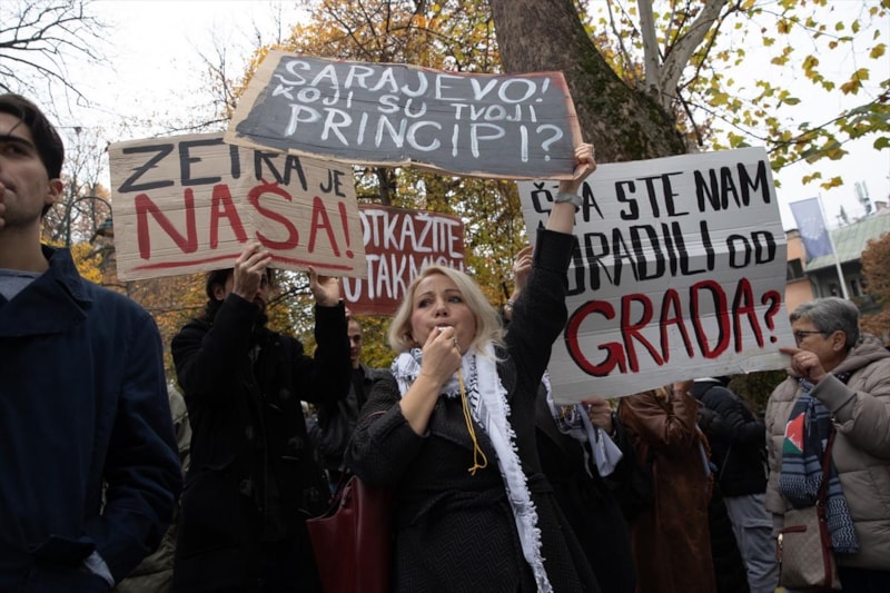 Maçın Saraybosna'da oynanmasına tepki gösteren protestocular, "Soykırımcı devletlere misafirperverlik yok", "Maçı iptal edin", "Saraybosna! senin ilkelerin ne?" yazılı pankartlar taşıdı.