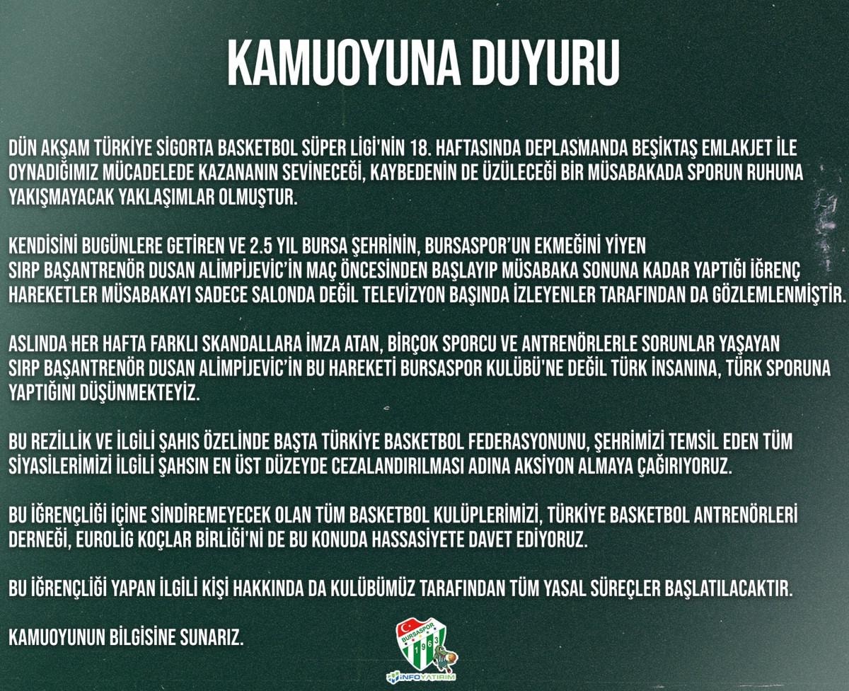 Bursaspor'un "Kamuoyuna Duyuru" başlığıyla yaptığı açıklamada, yeşil beyazlı takımın eski çalıştırıcısı olan Beşiktaş Başantrenörü Dusan Alimpijevic hakkında sert ifadeler kullanıldı.